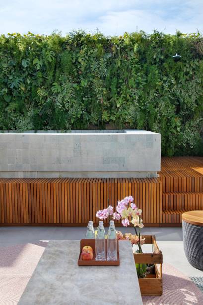 Na área externa do segundo pavimento, um dos destaques é jardim vertical ao fundo da piscina, que se integra às copas das árvores da rua, aumentando a sensação de bem-estar.