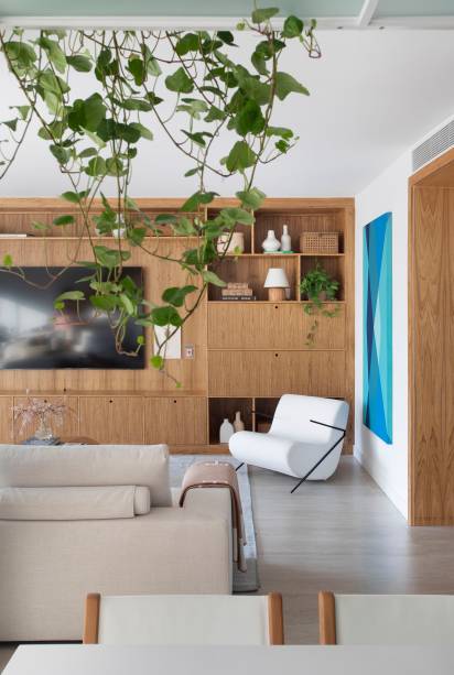 A cozinha e a varanda foram integradas à sala, compondo um generoso living. Para aquecer o espaço e ao mesmo tempo transmitir leveza, os arquitetos elegeram um piso com pegada mais natural – o porcelanato Decortiles Travertino 120x120cm – aliado às paredes brancas e à marcenaria em folha natural de freijó, que cobre toda a parede principal, composta pelo painel da TV e estante, com nichos abertos e fechados.