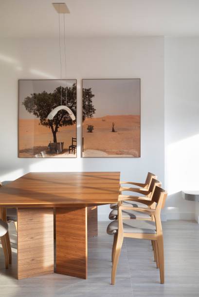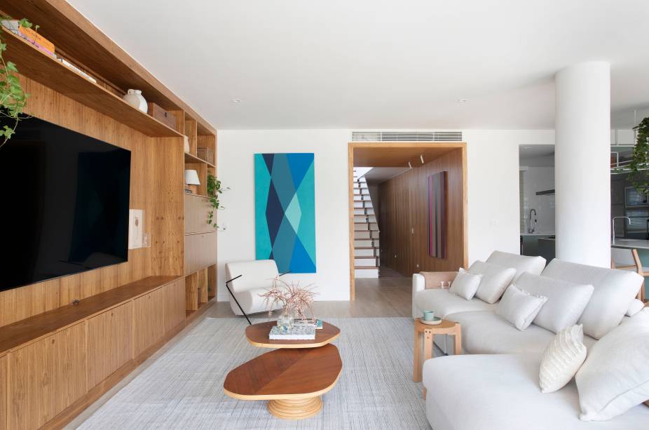 No primeiro piso, a sala de estar ganhou um hall de entrada com acesso ao pavimento superior, todo revestido em madeira, que destaca o quadro da artista plástica Ana Bia Grijó.