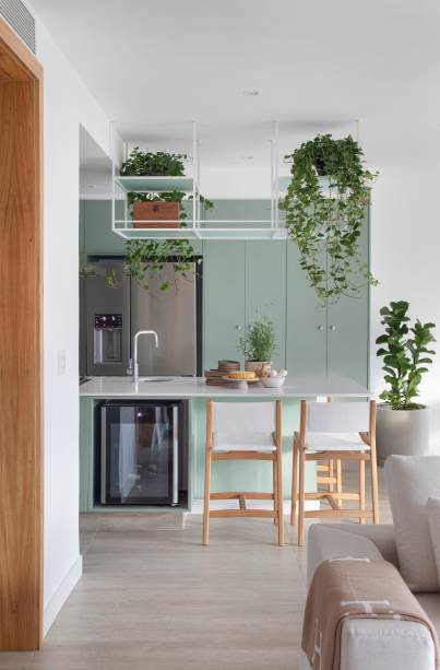 Na cozinha, o verde-menta dos armários (executados pela Todeschini) traz o verde da paisagem para dentro do apartamento, com o apoio de uma ilha central e de um módulo aéreo, feito com uma estrutura metálica pintada na cor branca, que ajuda a setorizar os ambientes e funciona como um suporte extra para plantas e objetos, conferindo um toque despojado à composição. Ainda no living, foi criado um banco em alvenaria sob as janelas, que pode ser usado como assentos extras para receber visitas.
