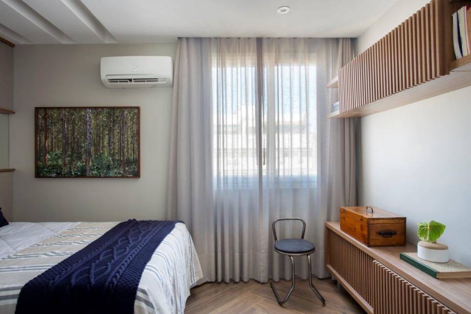 Em interiores, o destaque fica para o piso em porcelanato amadeirado, paginado em chevron, que invade 100% do apartamento, criando uma base única e contínua que faz o imóvel parecer mais amplo. Os cobogós de fechamento da área de serviço são originais e foram mantidos, adicionando mais charme ao projeto e a estante de serralheria é toda de encaixe, podendo ser desmontada. Veja mais na galeria!