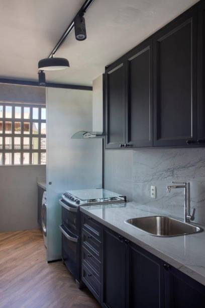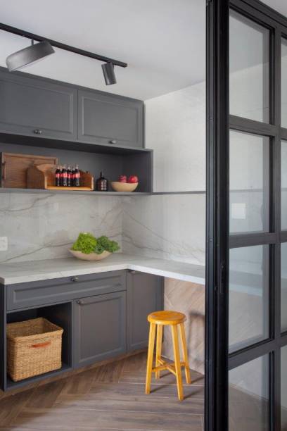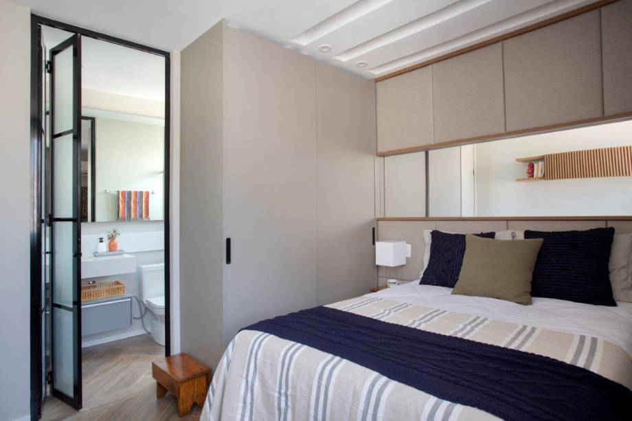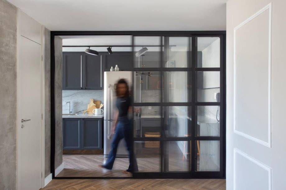 Assim, após a reforma, o apartamento passou a ter duas suítes, além do lavabo que hoje atende a área social. Eles também mudaram o quarto principal, antes nos fundos, para uma posição melhor na planta do imóvel. Outro destaque foi a abertura da cozinha para a sala, com portas de correr de esquadrias pretas com fechamento em vidro, que garantem claridade e maior integração dos ambientes.