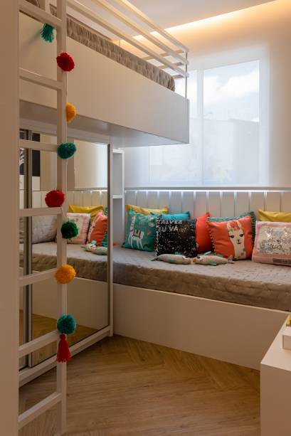 A ala íntima também conta com soluções que valorizam e dão mais amplitude. No quarto de casal, por exemplo, mesmo com um espaço limitado, o cômodo não deixa de ter comodidade, elegância e funcionalidade, tudo isso graças a marcenaria bem pensada.