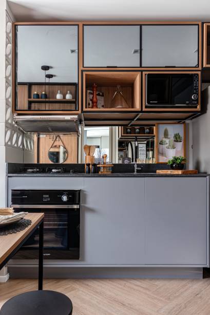 Na parte social, o mix entre cores neutras e escuras são predominantes, porém os dois espaços não ficam monótonos. “Nosso cliente queria um apartamento com uma paleta inspirada em tons de cinza e tampos escuros, uma combinação que, via de regra, não indicamos muito.