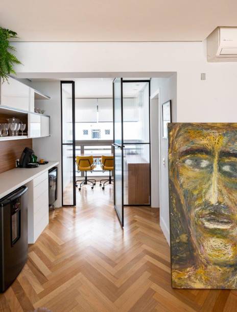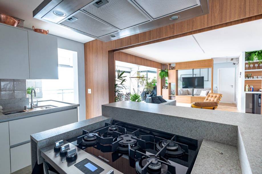 Na área social o grande destaque é o piso de madeira com paginação diferenciada. O painel existente deixa ou não a mostra a cozinha.
