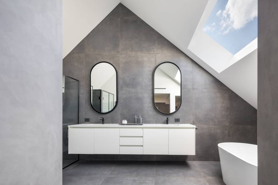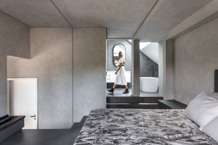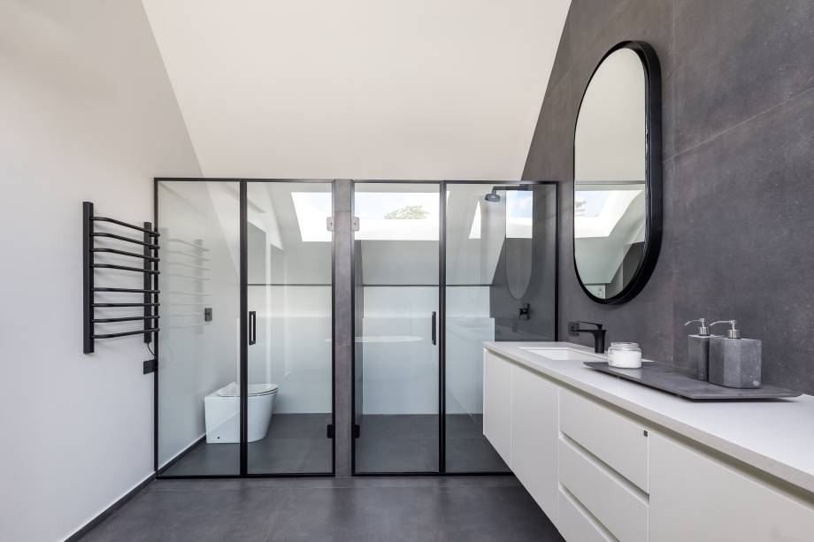 A área originalmente destinada ao sótão foi aproveitada e o teto foi removido, dando lugar a um amplo banheiro integrado ao quarto, onde a inclinação da cobertura se torna um elemento de composição e serve para criar uma claraboia para iluminação natural. O closet está integrado ao quarto, que, assim como o restante da casa, tem design contemporâneo.
