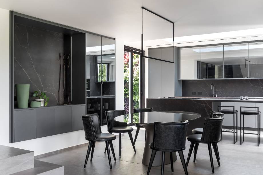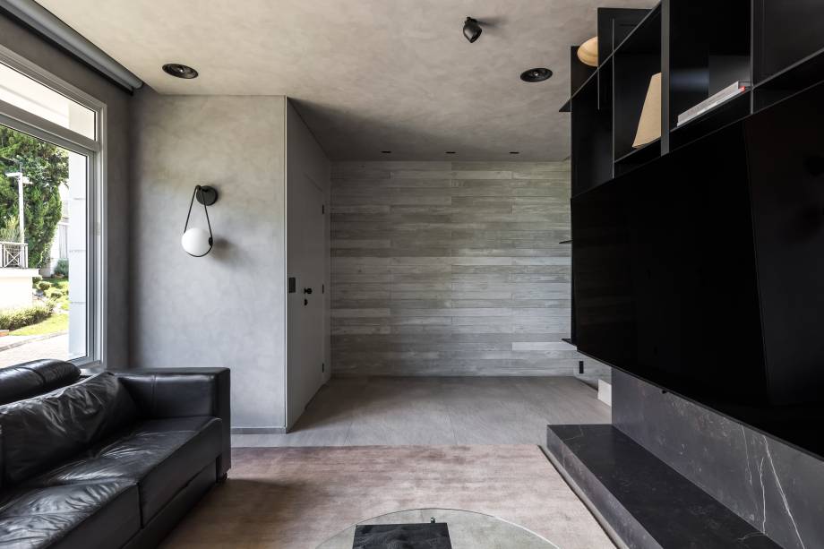 A escolha de esquadrias e metais pretos, aliada ao mobiliário moderno escolhido e o uso de tons sóbrios nos revestimentos colaboram para a criação de uma atmosfera de estilo industrial.