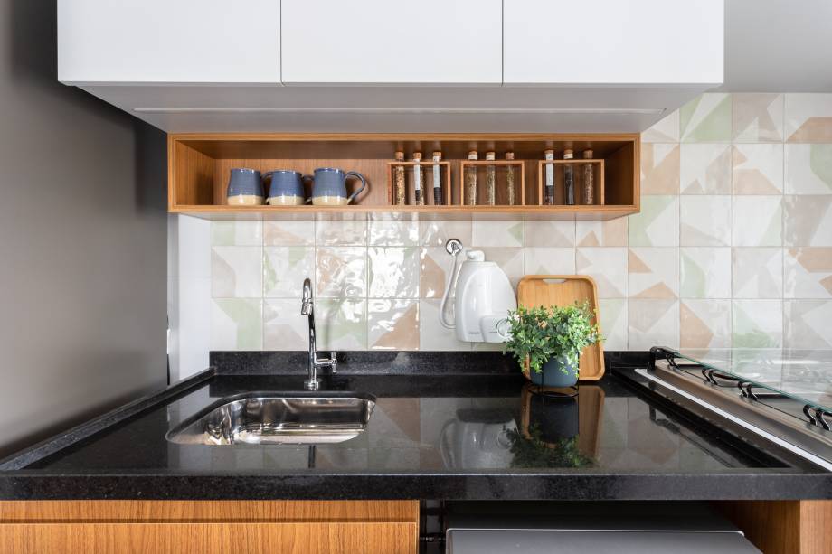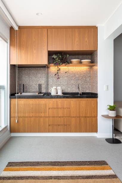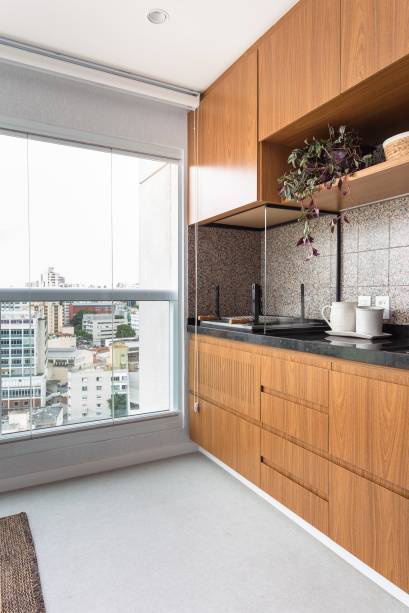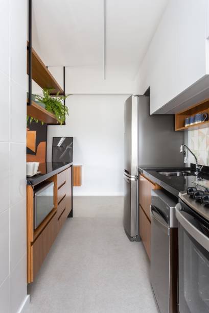 Na configuração estreita e comprida, elas pensaram em um layout para o dia a dia sozinho ou para quando contar com companhia para cozinhar. De tão bem otimizada, a cozinha recebeu uma bancada de pia com 80 cm de extensão para embutir o fogão de 4 bocas e até uma lava-louças.