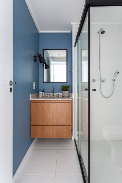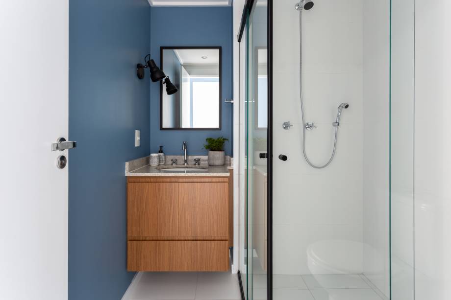 Concebido como essência convidativa, o banheiro social foi eleito para fazer as vezes de lavabo. Além da pintura azul, que levantou o astral, foi trabalhado com um box de vidro e serralheria preta que se alinha com a moldura do espelho.