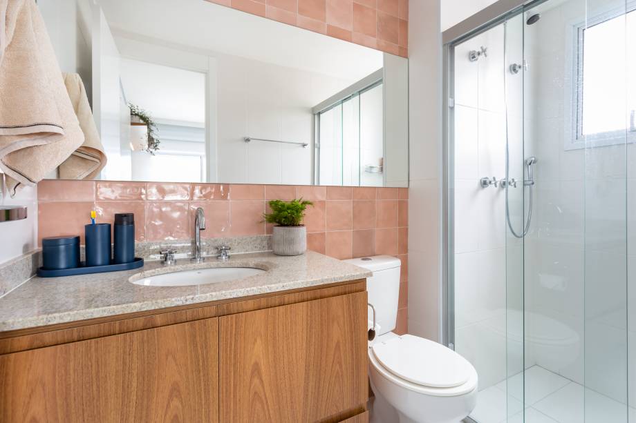 Já no banheiro principal, Claudia e Monike escolheram um revestimento rose apenas para a parede principal, onde está a bancada, dando um visual bem diferente do revestimento neutro entregue pela construtora. O espelho, seguindo de uma ponta a outra, amplia o ambiente.