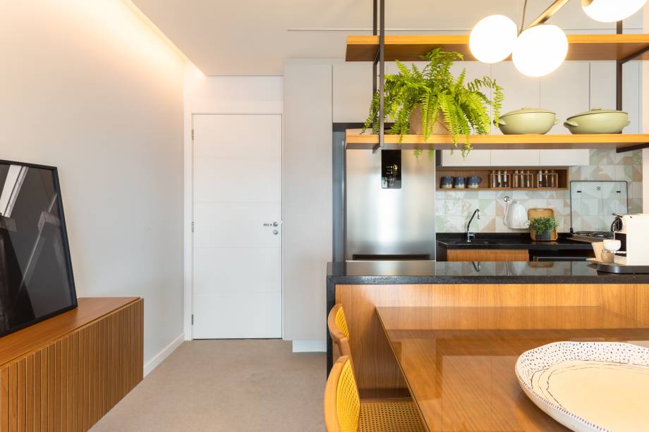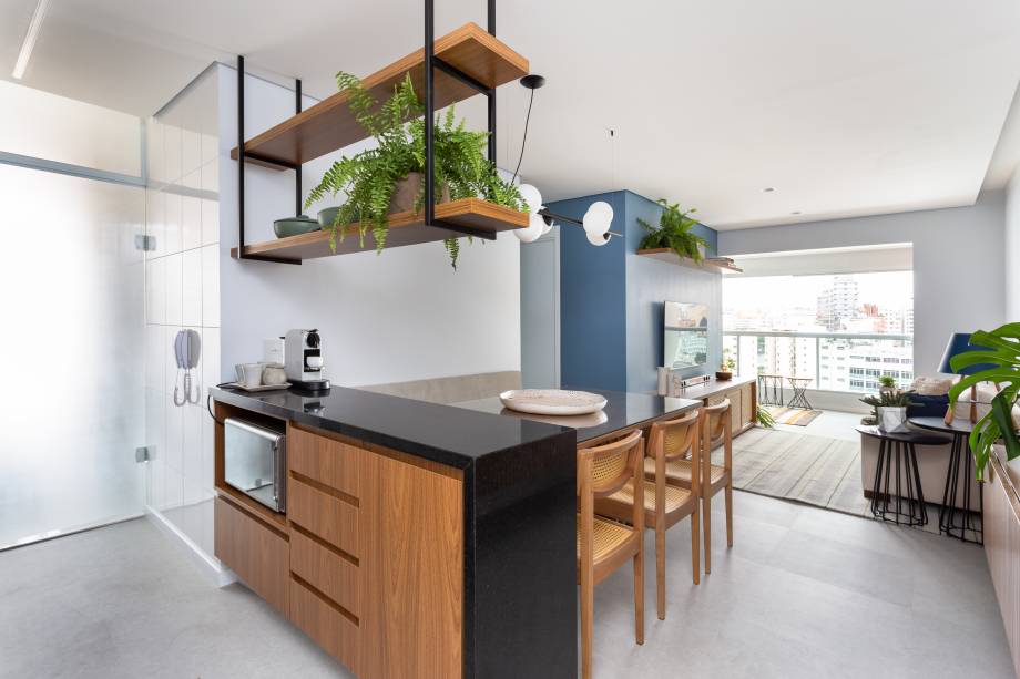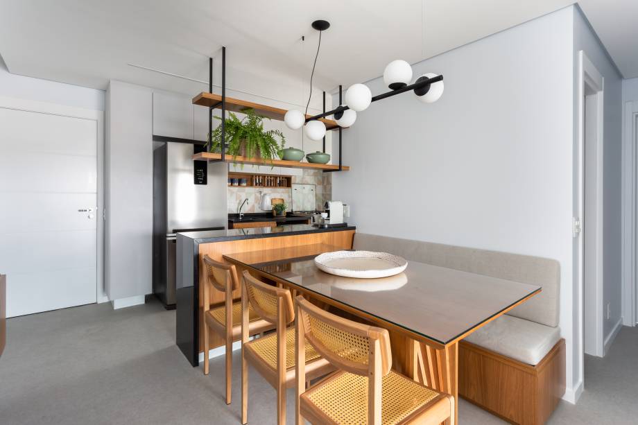 Na planta original da construtora, a cozinha já ficava aberta para a sala. Entretanto, as arquitetas acabaram avançando alguns centímetros do jantar para que o morador ganhasse mais espaço de bancada.