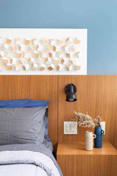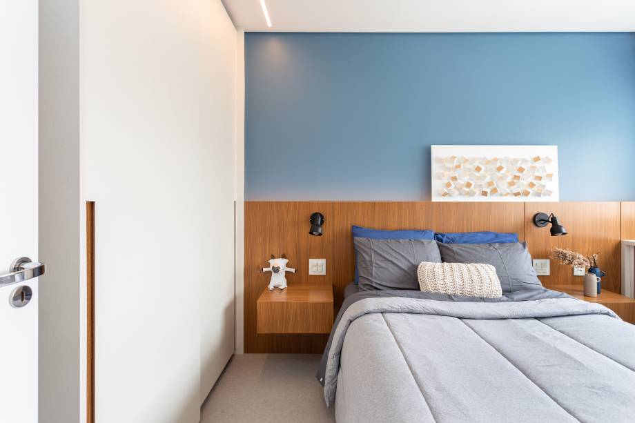Em busca da tranquilidade e da originalidade, mais uma vez a tinta azul acrílica se evidencia ao completar a parede onde foi instalada a cabeceira em MDF amadeirado Louro Freijó.