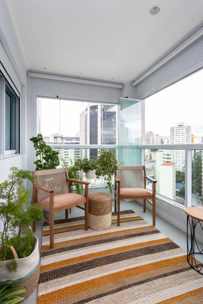Passando para a área de estar da varanda, a disposição de uma vibe mais intimista e descontraída foi o ponto de partida para uma identidade mais natural e rústica, conquistada por meio do verde das plantas, os tons terrosos presentes no tapete de tear e o par de poltronas.