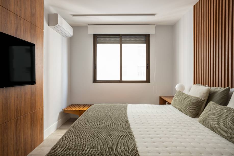 Com o pé-direito limitado, a iluminação foi pensada em trilhos, proporcionando luz direta e indireta; LEDs em móveis estratégicos adicionam destaque e conforto visual.