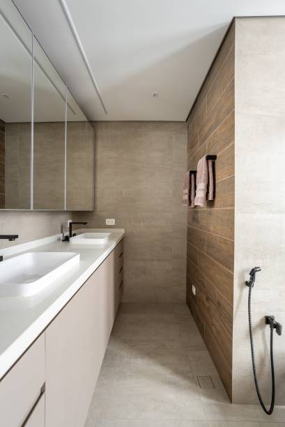 No banheiro do casal, o Ecowood da Portobello adiciona uma sensação de acolhimento.