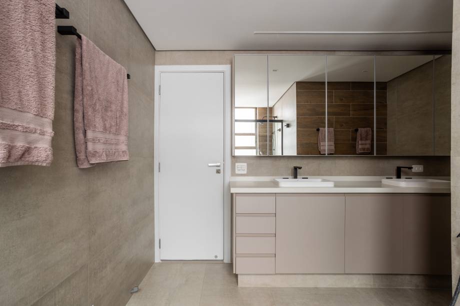 Os banheiros foram totalmente redesenhados, com revestimentos em tons de cinza e detalhes personalizados em cada box, refletindo o estilo de cada filha.
