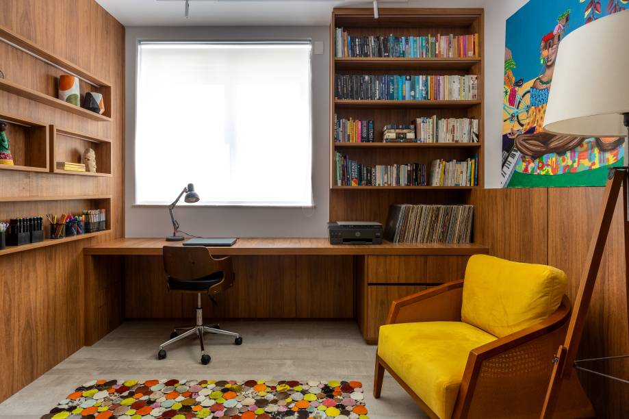 Um dos quartos foi transformado em um escritório acolhedor, com uma escrivaninha confortável, estantes para livros e iluminação de fita LED, que dá um toque moderno e personalizado ao espaço.