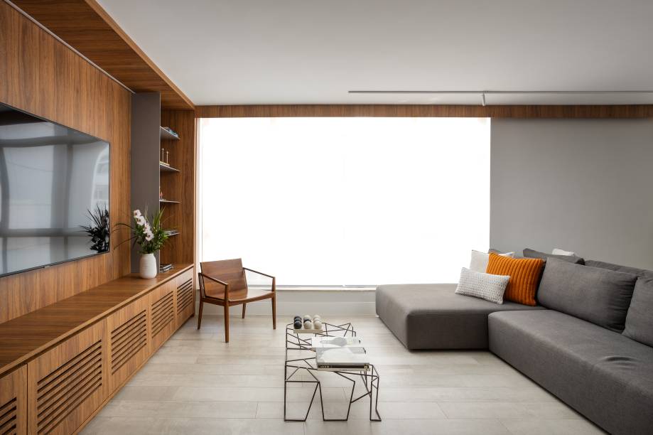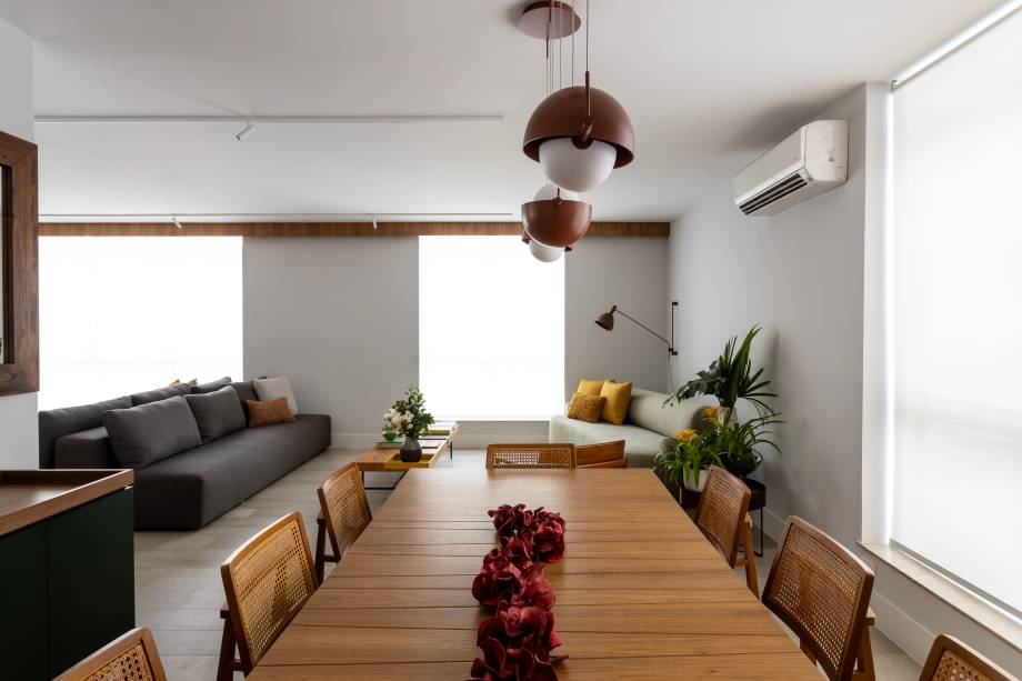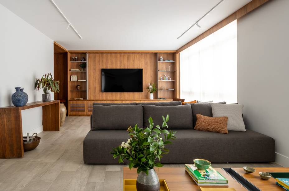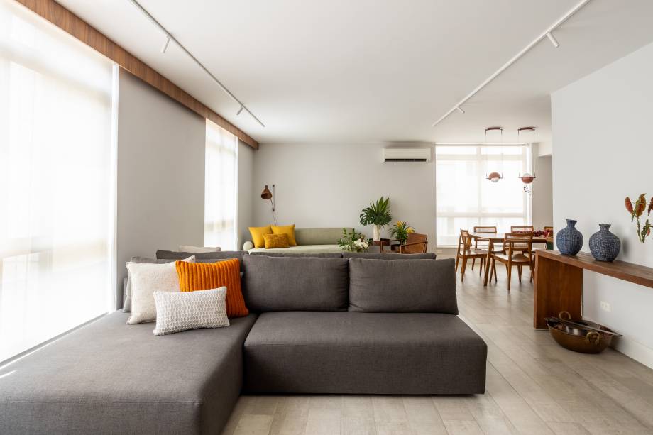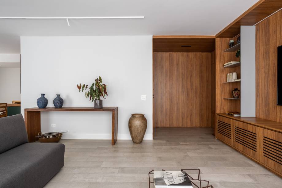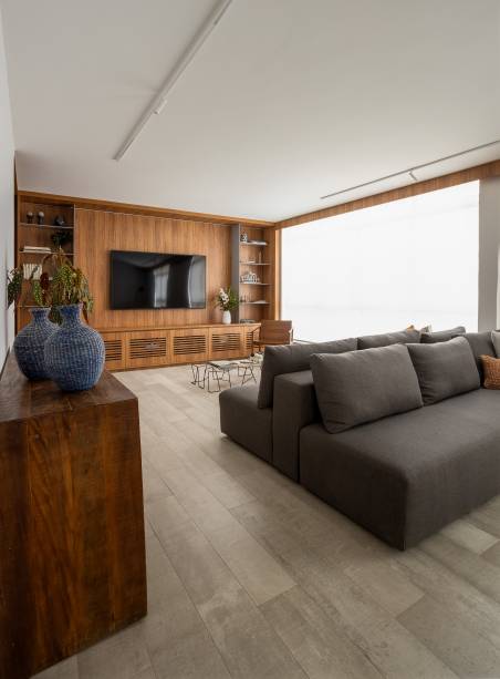 Para integrar melhor os ambientes, o layout foi reorganizado, ampliando a sala e a cozinha e reformulando os banheiros e o lavabo. O piso em porcelanato cinza oferece continuidade e profundidade ao espaço, enquanto a madeira confere um toque de aconchego, estabelecendo uma base neutra e elegante.