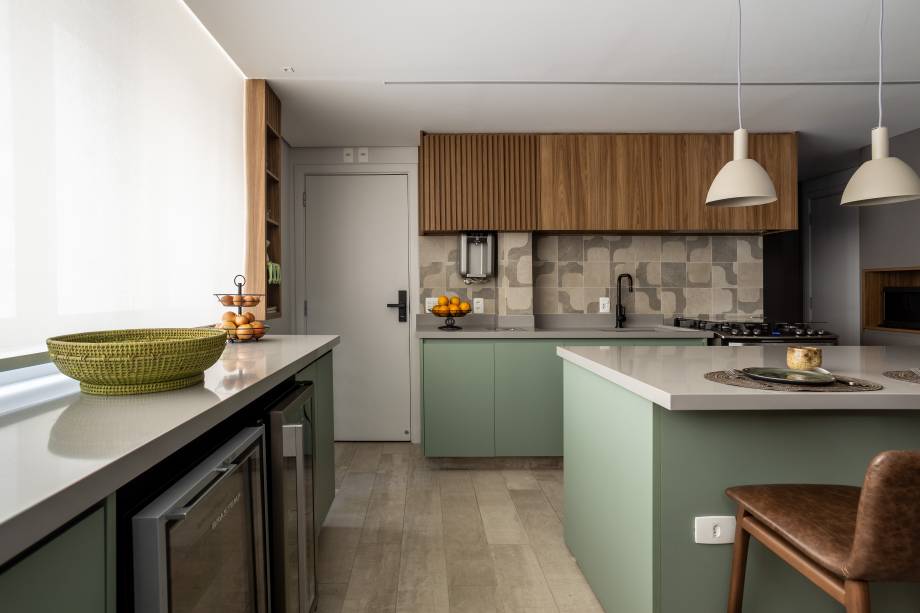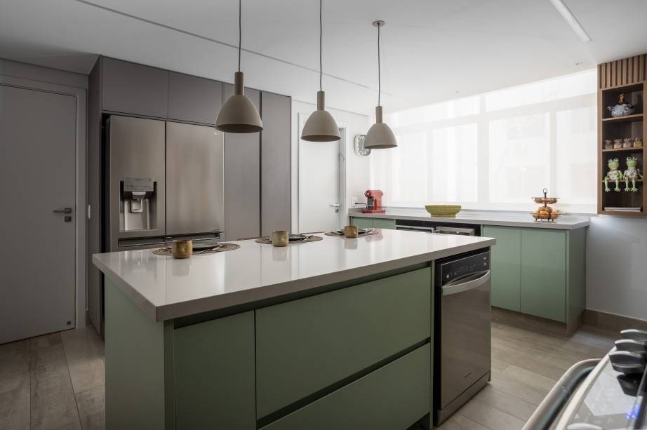 A cozinha é um dos pontos centrais do projeto, com uma paleta de cinza e verde menta, escolhida pelos moradores, tornando-se um espaço prático e convidativo para momentos em família. Áreas de serviço e armários dos quartos foram executados pela Dellano Atelier, enquanto os demais móveis planejados foram desenvolvidos pela arquiteta.