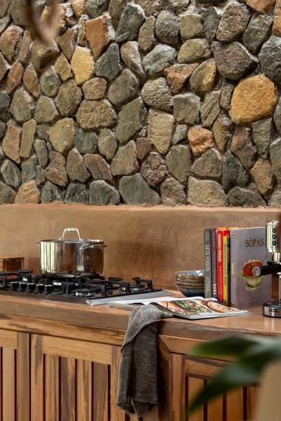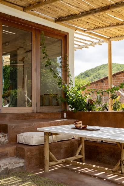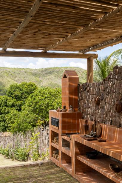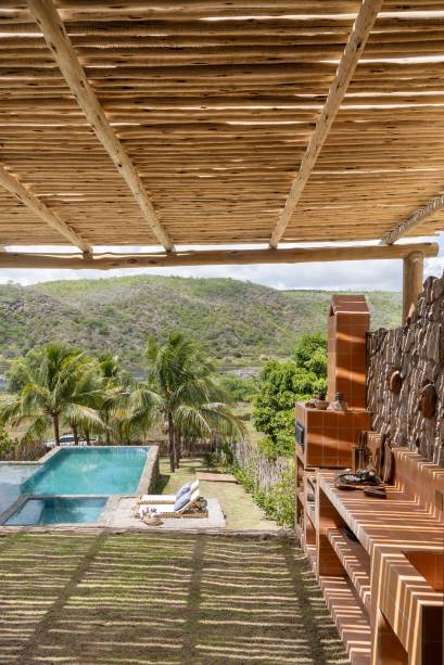Cozinha ao ar livre e sofá de alvenaria dão ar rústico a casa de praia inspirada no sertão