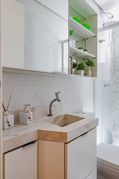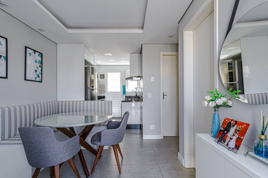 Por ser um imóvel de alvenaria estrutural, não foi possível fazer alterações na planta. Somente alguns detalhes dos revestimentos da cozinha e do banheiro foram mudados. Sendo assim, o diferencial ficou realmente no mobiliário sob medida e na iluminação. “Na sala e na cozinha, utilizamos gesso para deixar os ambientes mais aconchegantes e funcionais”, diz a arquiteta. Além disso, todas as cores usadas são em tons claros e Ana também utilizou espelhos nos móveis e na decoração. Esses detalhes trazem a sensação de um ambiente maior e mais leve.