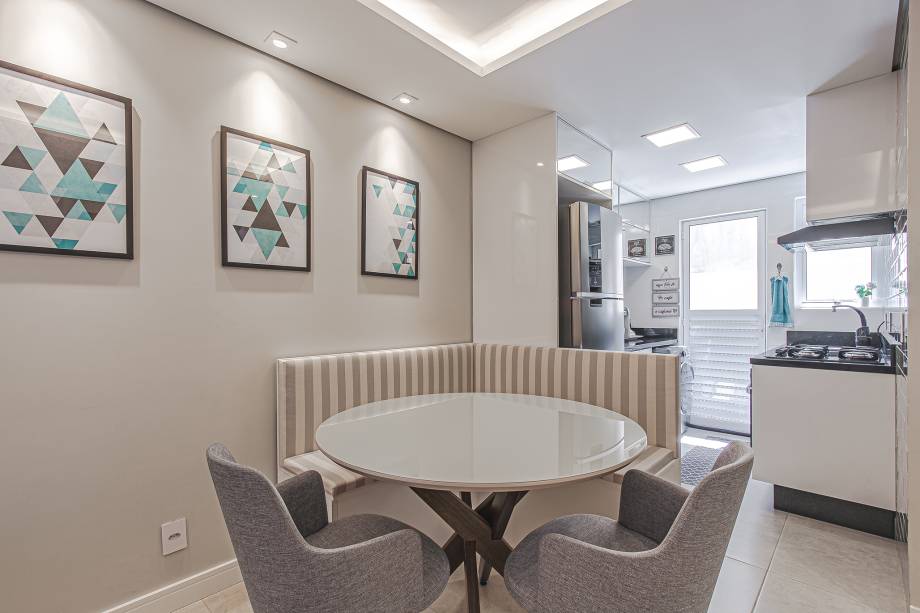 A parte social da casa é ideal para receber amigos e familiares. “Os clientes faziam questão de ter uma mesa para, pelo menos, quatro pessoas”, diz Ana, que optou por montar um canto alemão como forma de poupar espaço. O banco faz também a divisão entre a cozinha e a sala de estar, mas, ao mesmo tempo, mantém o ambiente integrado e aberto, permitindo por exemplo, que a pessoa cozinhe e interaja com os convidados na sala.