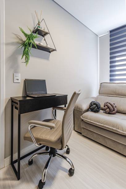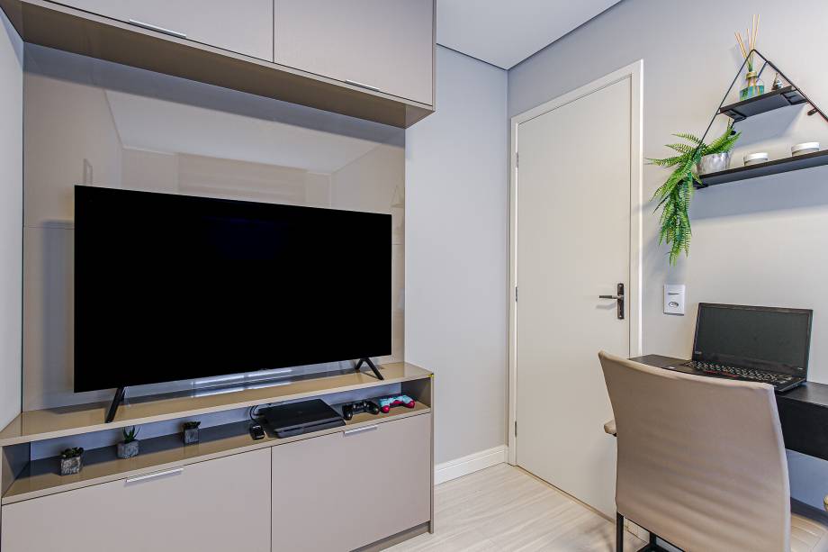 A princípio, os moradores queriam utilizar o segundo quarto como escritório, entretanto, como a área era reduzida, eles resolveram transformar o cômodo em uma sala de TV. Com a chegada da pandemia, novas mudanças precisarem ser feitas. O casal, trabalhando em home office, notou a necessidade de criar um espaço para esta função em casa. “Tivemos que fazer algumas alterações no projeto para que eles conseguissem trabalhar em casa de forma confortável e sem atrapalhar um ao outro”, conta Ana.