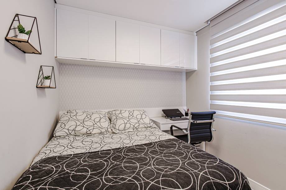 A arquiteta incluiu um pequeno home office neste segundo quarto, e deixou o ambiente versátil, com um sofá confortável e uma mesa que eles podem usar para trabalhar. Outra solução para atender a essa necessidade, foi usar a mesa de cabeceira do quarto de casal como um home office também. Agora eles têm a opção de trabalhar em dois lugares, na sala de TV ou no quarto. “Assim como em todos os projetos, as soluções para os ambientes estão diretamente relacionadas às necessidades dos clientes para aquele espaço”, afirma a arquiteta. Como o ambiente do quarto não é muito grande, Ana optou por fazer os armários acima da cama, de forma que esta pudesse ser maior e mais confortável.