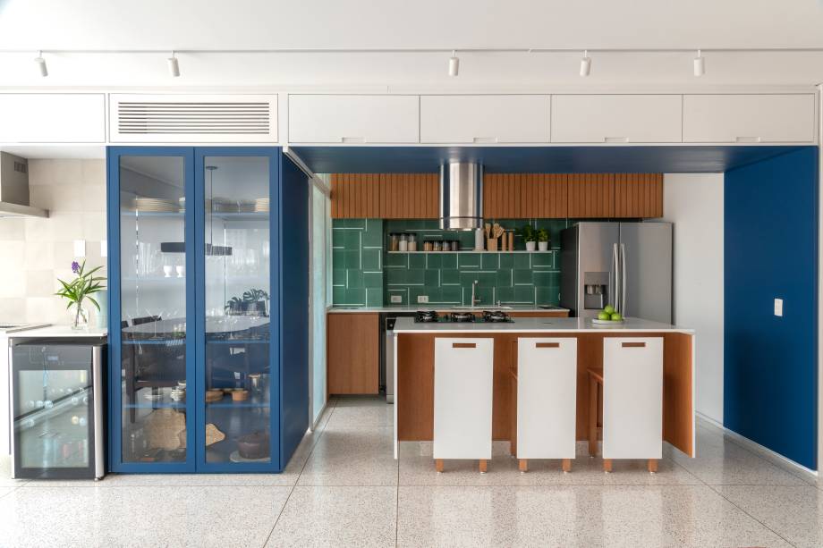 Cristaleira e pórtico são envolvidos por azul neste apartamento de 93 m²