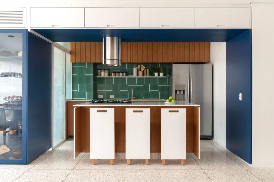 Um dos grandes destaques do projeto é a marcenaria, que foi responsável por reorganizar os ambientes de forma inteligente. A sala e a cozinha foram conectadas por um pórtico azul – um elemento que, além de dividir os dois espaços, deu uma nova escala a ambos. Essa marcenaria também incorporou soluções práticas, como armários para a cozinha, uma bancada de apoio para a lavanderia e uma cristaleira para a sala.