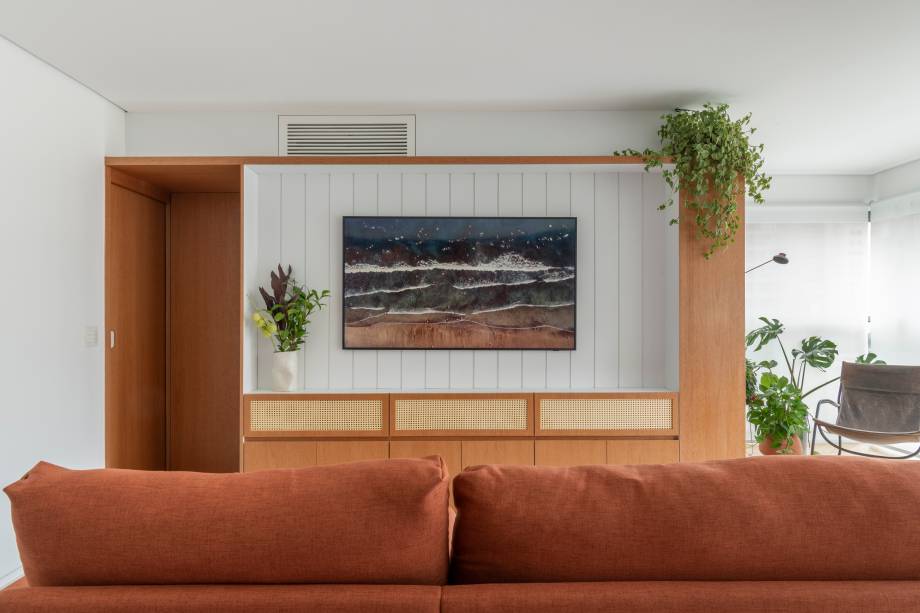 Outra peça chave é o armário que divide a sala da suíte. Ele guarda as portas dos quartos e o sistema de ar-condicionado de forma discreta, além de oferecer um cantinho para leitura e café na varanda. Na suíte, a marcenaria também aproveita o espaço de forma criativa, com um banco sob a janela que funciona como baú e uma cabeceira que cria um closet, otimizando ainda mais a área.