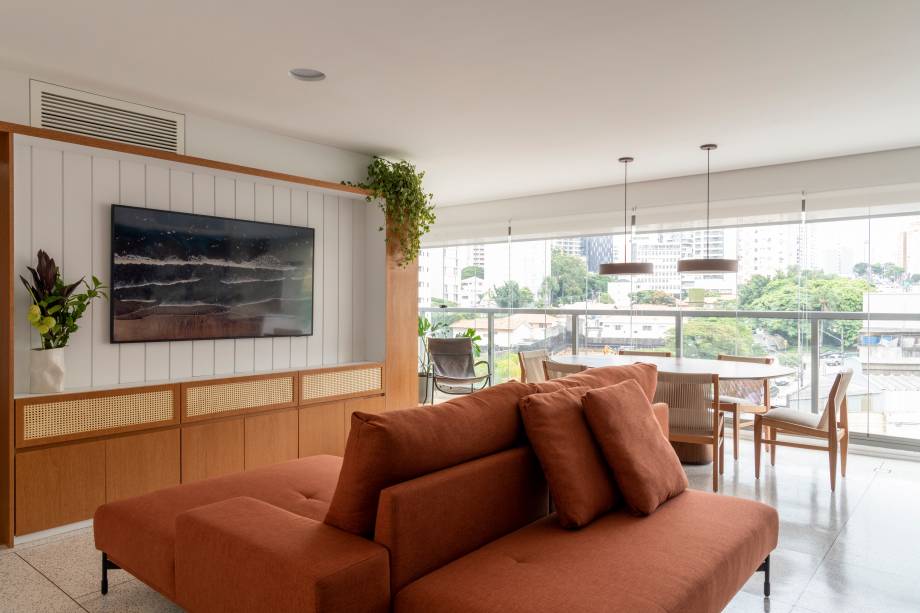 Com três dormitórios originalmente, o imóvel tinha a maior parte da área dedicada à varanda, o que deixava os demais ambientes com dimensões limitadas. Para solucionar isso, o projeto propôs integrar a varanda aos espaços internos, criando uma sala e uma suíte mais amplas.