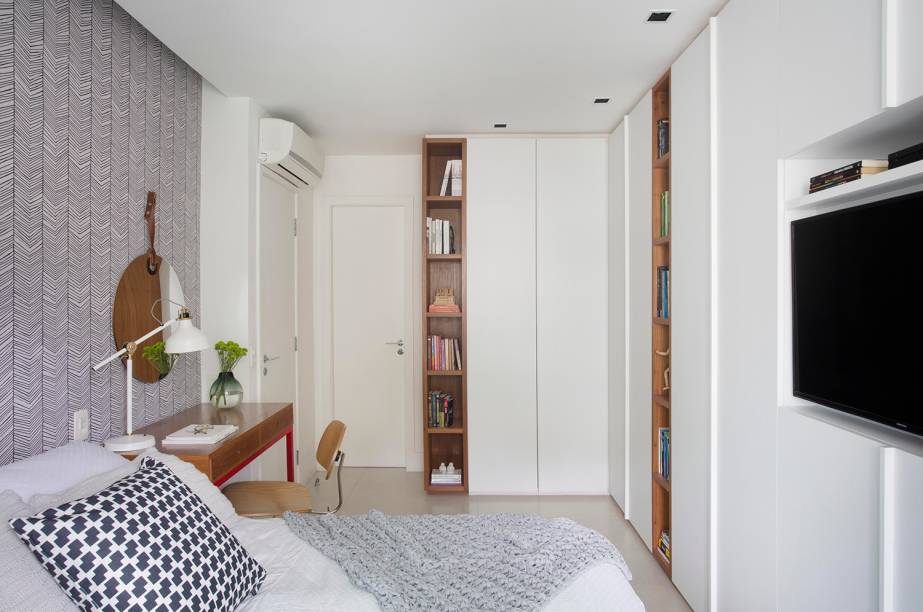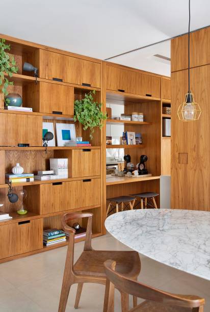 “A solução encontrada para viabilizar a integração entre a sala e a cozinha, aumentando a metragem do living, e como o desenho da marcenaria, especialmente nesses ambientes, aqueceu e trouxe unidade ao projeto”, aponta o arquiteto.