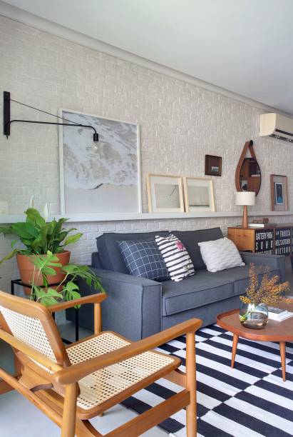 Quanto à paleta de cores e os materiais escolhidos para a decoração, foi criada uma base neutra, com piso cinza, paredes brancas e marcenaria em freijó, branco e cinza. A parede de tijolinhos cria uma textura na parede principal, mas mantém a base neutra para permitir o uso de móveis, objetos de decoração e tapetes mais marcantes.