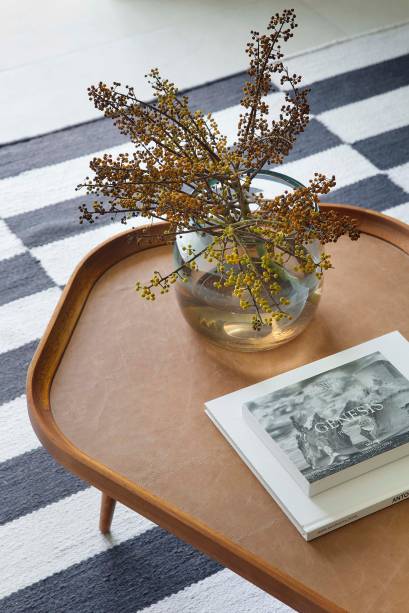 O grande volume em freijó voltado para a sala camufla também a porta do banheiro social e se confunde com a porta de correr da cozinha, deixando o visual mais limpo e aquecendo o ambiente”, explica Gustavo.