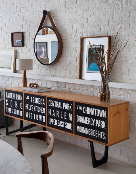 “O ponto de partida do projeto foi a integração. O casal queria um apartamento leve, amplo, aconchegante e, principalmente, com a possibilidade de integrar sala e cozinha”, explica Ana. “Como o casal gosta de viajar, trouxemos algumas referências especialmente para a sala, como o aparador do jantar, com locais de NY e o tijolinho na parede principal”, descreve.