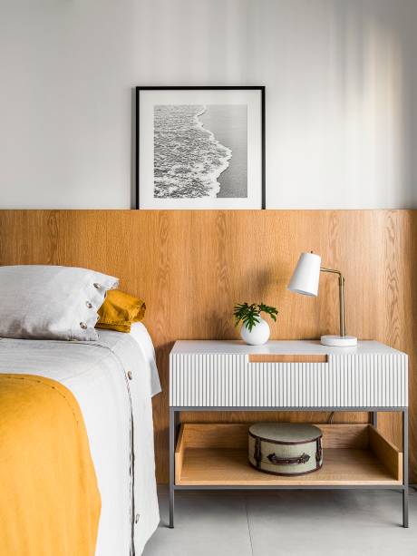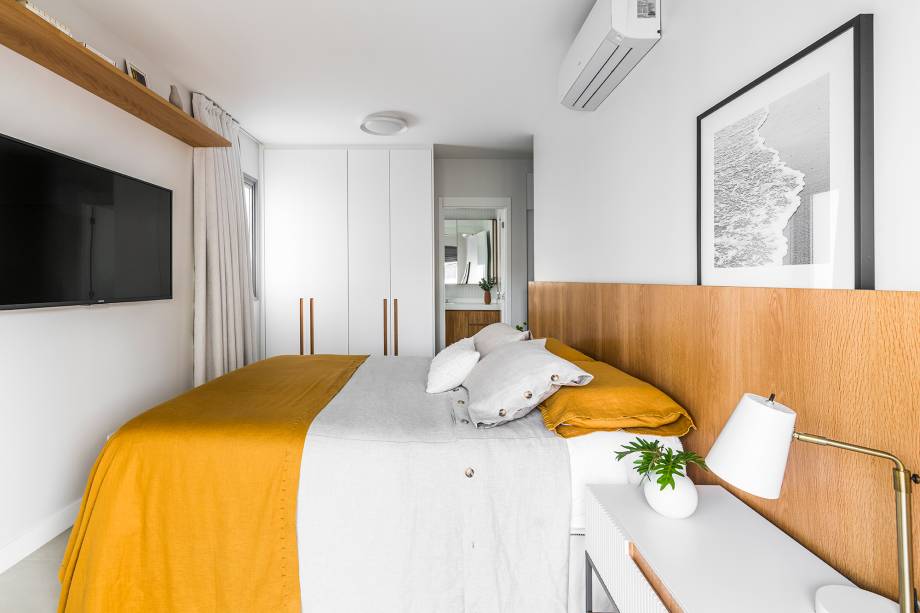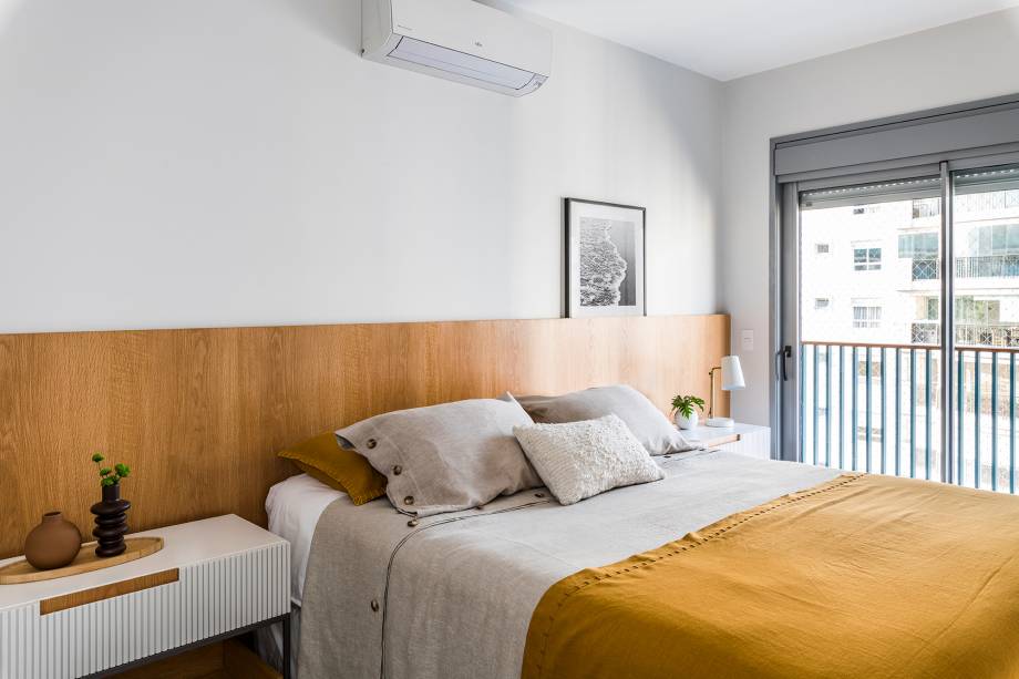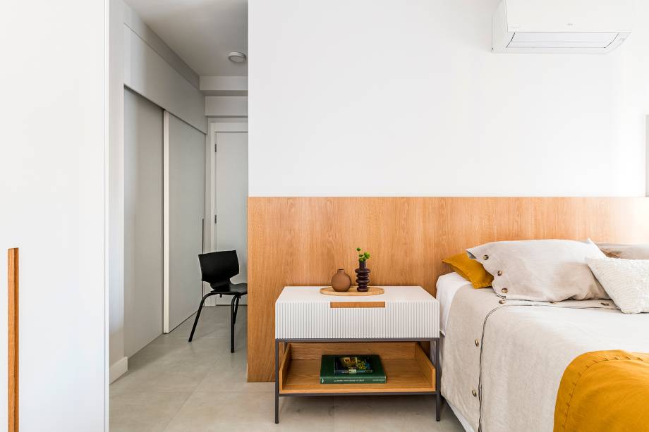 O casal também pediu bastante espaço nos armários na suíte principal, pois ambos tinham muitas roupas para guardar. Então, um closet foi criado com a demolição da parede entre o dormitório e a despensa da cozinha. Já a cabeceira, que percorre toda a parede, e as prateleiras foram feitas de madeira natural carvalho americano. As mesinhas têm gavetas de laca ripada, pés de serralheria e prateleira de carvalho americano.