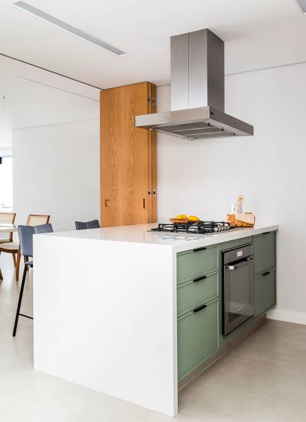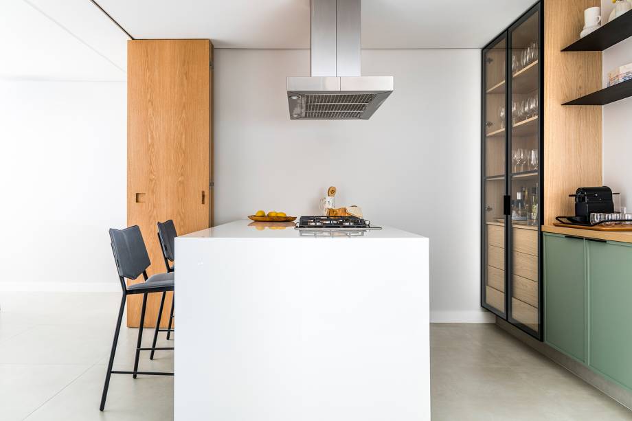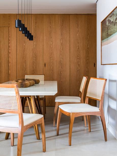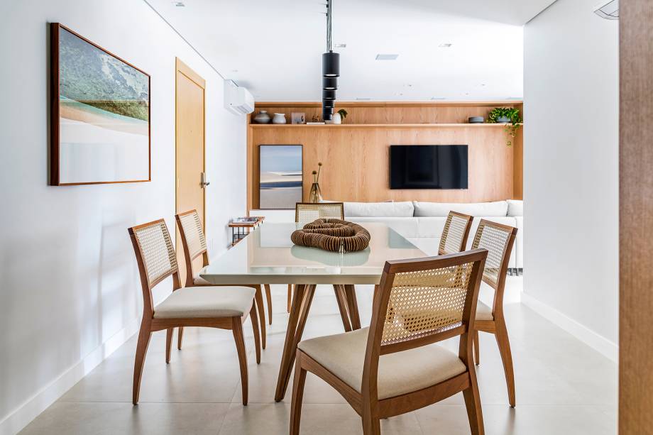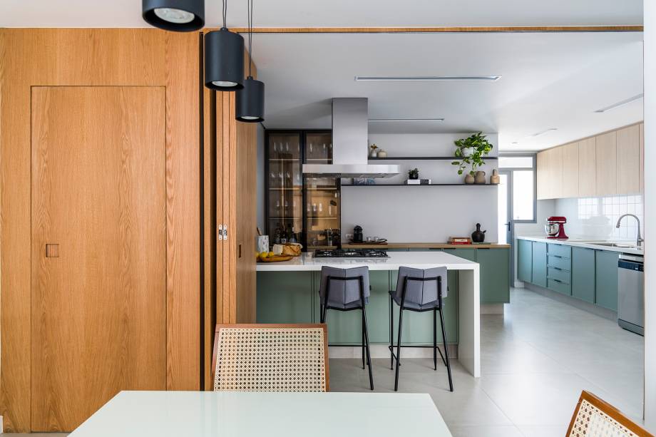 “Demolimos a parede entre o quarto de TV e a cozinha para ampliá-la e também a parede entre a cozinha e a sala de jantar, permitindo uma integração dos ambientes”, conta a profissional. Um painel com portas camarão de madeira natural carvalho americano divide os dois últimos ambientes, oferecendo maior flexibilidade de layout.