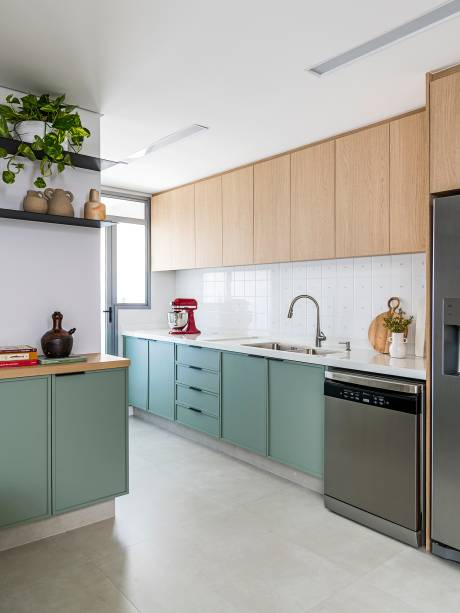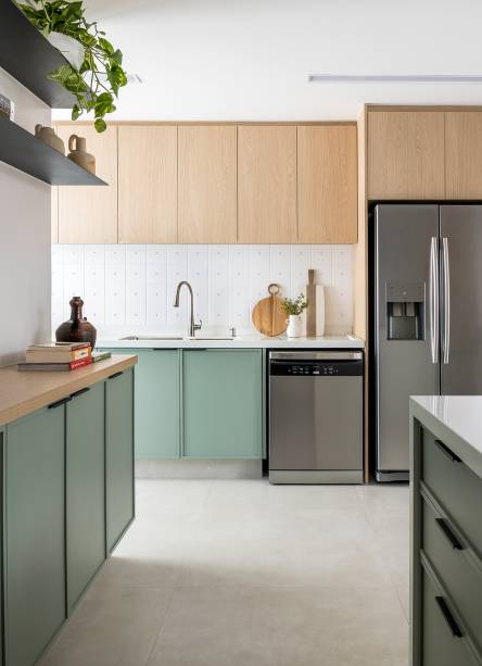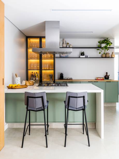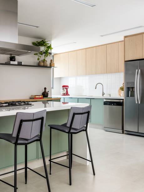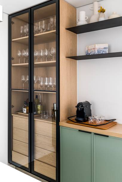 “Optamos pela fórmica num tom verde menta, ao invés de uma proposta mais clássica e com tons sóbrios. A composição com o MDF carvalho e os detalhes pretos (nos puxadores, portas da cristaleira e nas prateleiras metálicas), trouxeram charme e modernidade ao ambiente”, conta a profissional.