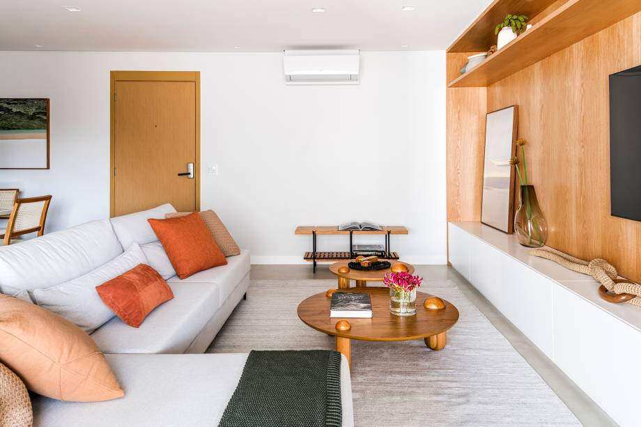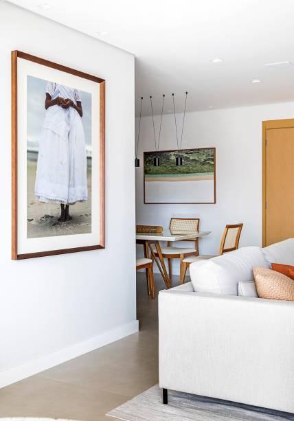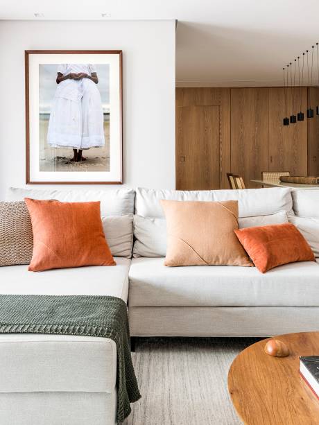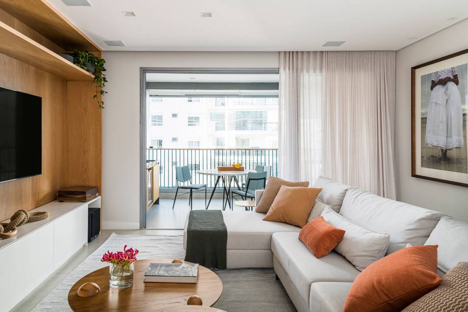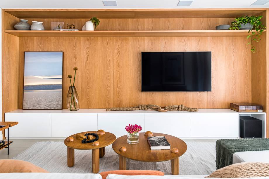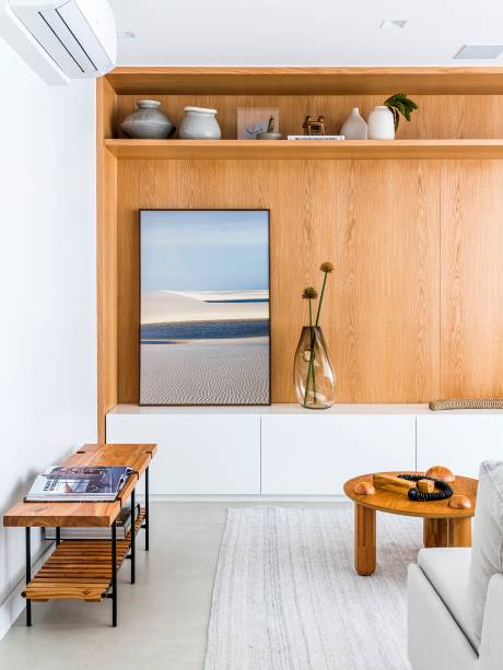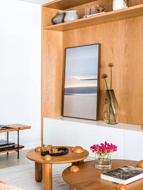 A estante da sala de estar prioriza as linhas retas e ocupa toda a parede (5m) em frente ao sofá. “Os clientes gostam muito de arte, em especial de fotografia. As obras dos fotógrafos Akira Cravo e Quel Casadei trazem personalidade”, explica Juliana.