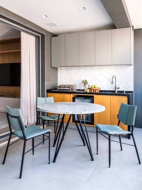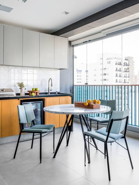 Como o jovem casal gosta de cozinhar e fazer churrasco com os amigos, o foco da designer de interiores Juliana Casadei para este apartamento de 175 m² em São Paulo foi a criação de uma cozinha ampla e integrada, além de uma varanda com churrasqueira – que, diferente da tendência atual, não foi integrada ao estar, preservando a esquadria e criando uma barreira para a fumaça.