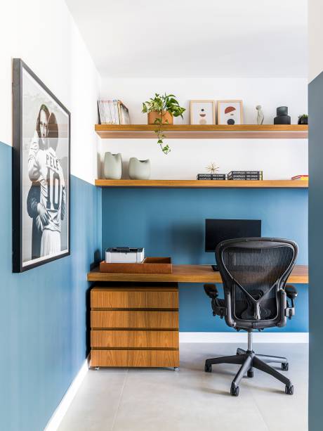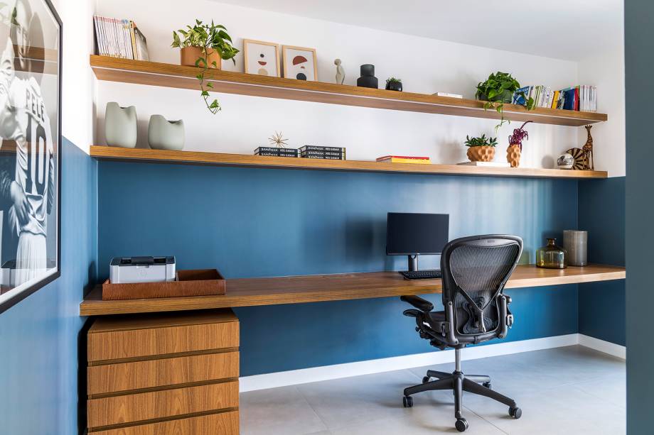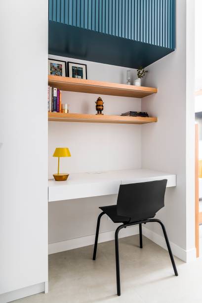 Outro pedido dos clientes foi ter um espaço adicional para trabalhar, além do escritório, já que ambos faziam home office com frequência. “Para isso, criamos um segundo espaço de trabalho na entrada do dormitório. Já o terceiro dormitório do apartamento ficou reservado para seus futuros filhos”, diz Juliana.