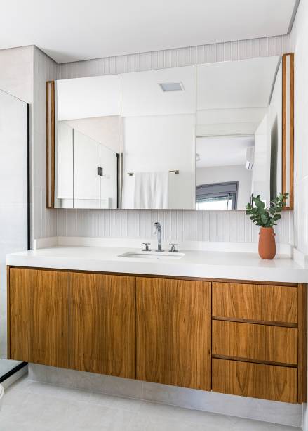 “No piso, utilizamos um porcelanato que remete ao granilite e para a cuba optamos por um modelo da Deca que ficou apoiado sob a bancada mais baixa. Escolhemos também metais pretos, um espelho com estilo industrial e arandela de madeira com luz indireta”, conta a designer.