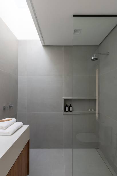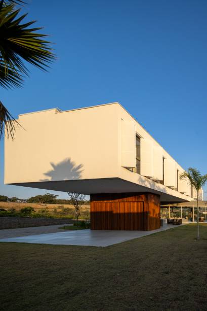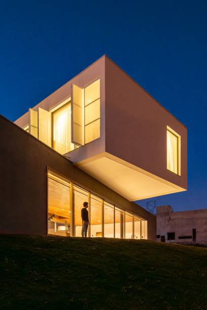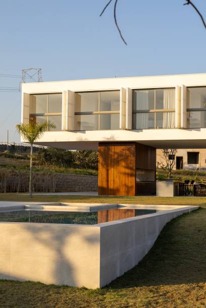 “Dois volumes sobrepostos dão a sensação de uma residência flutuante – movimento que foi pensado ao longo do desenvolvimento do projeto. Para que a vista da paisagem fosse mantida com a menor intervenção do terreno, realizamos estudos volumétricos e diversas simulações solares, e a partir daí optamos pela implantação da casa em dois níveis.”, explica Luciana.