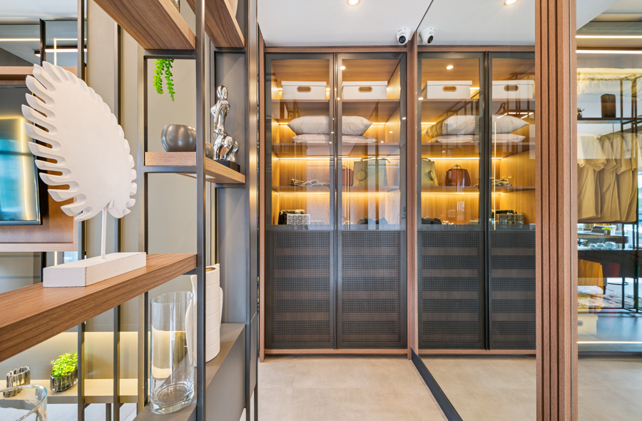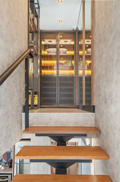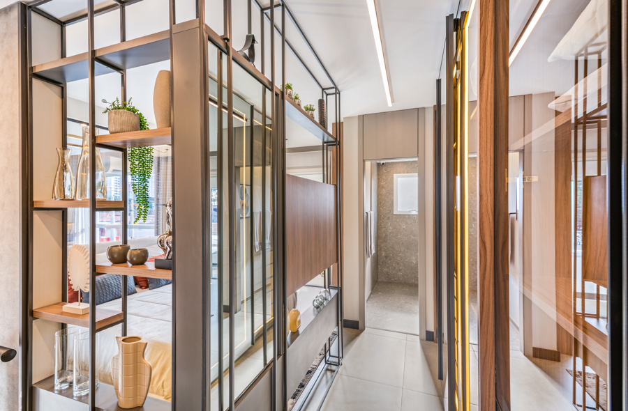 Outra estratégia é considerar um pé-direito duplo para garantir maior entrada de luz natural, o que pode ser usado a favor de todo o contexto quando trabalhado em conjunto com um bom projeto de iluminação.
