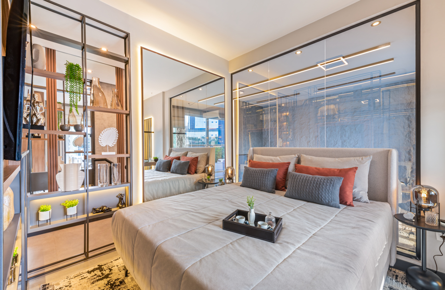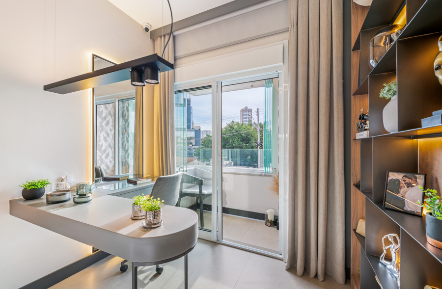 Apesar da metragem enxuta, este apartamento decorado de 75 m² é também duplex: o empreendimento Platina Norte Sul Patriani, em Campinas (SP), possui um mezanino que abriga quarto com closet e home office. “Integramos todos os espaços e não abrimos mão de uma boa iluminação nos móveis, o que, unindo com a iluminação natural do pé-direito duplo, trouxe um surpreendente resultado”, explica a arquiteta Brenda Almeida, da Construtora Patriani.