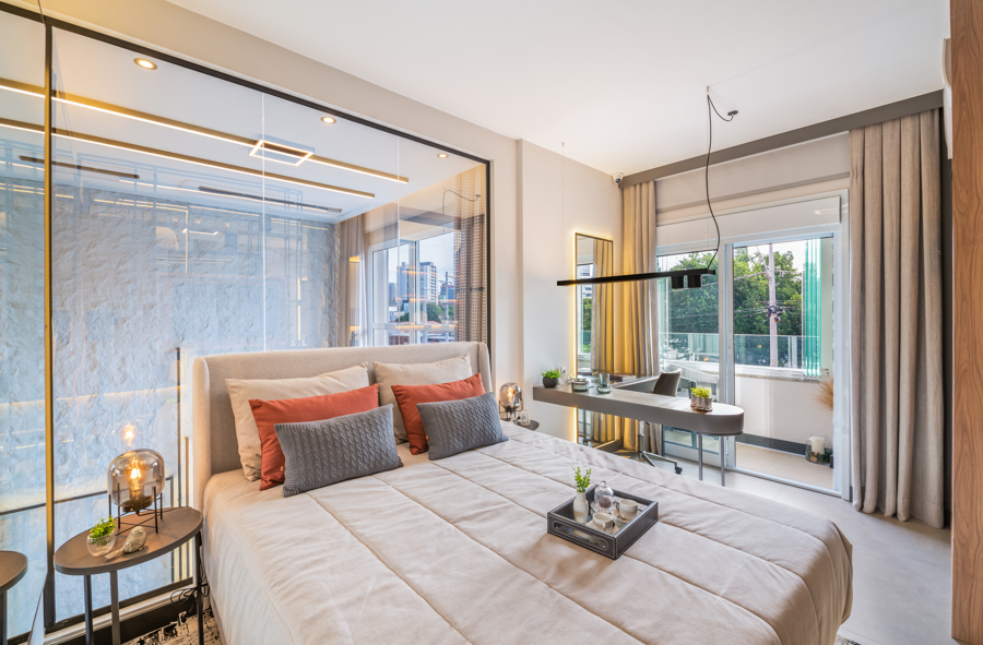 Além da ampla suíte, este apartamento também possui varanda gourmet com churrasqueira a carvão e um mezanino amplo, que conta com suíte, closet e home office.