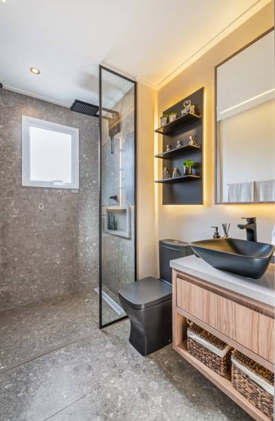 Aqui, a paleta de cores é moderna, com cinza, preto e tons de madeira média. Para dar movimento, há várias texturas, como o cimento queimado e revestimentos que se assemelham a pedra natural.