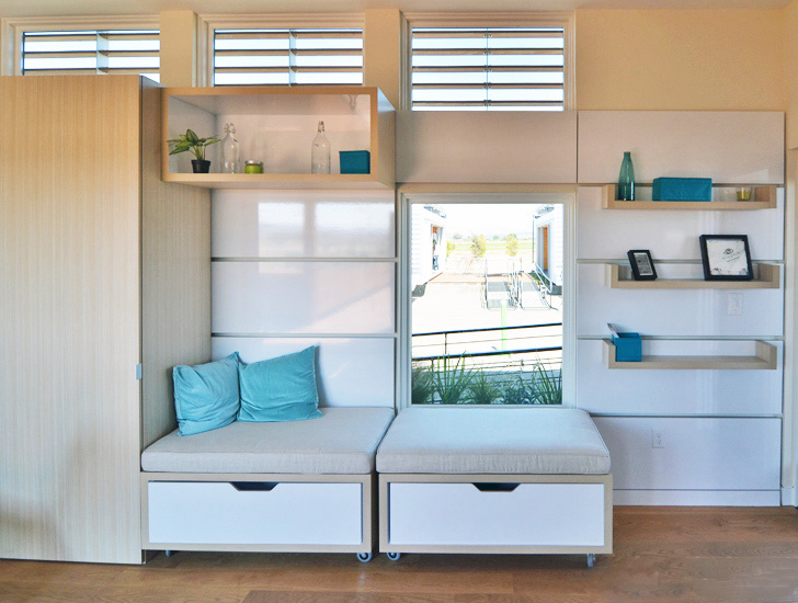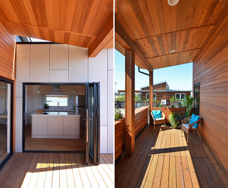 Ela tem apenas um quarto e um banheiro, dando grande ênfase para a vida ao ar livre. Dois ambientes, um pátio e um alpendre, envolvem a casa. Além disso, na parede verde e no telhado’ verde é possível plantar alguns vegetais comestíveis. As portas dobráveis de vidro aumentam a sala de estar e a cozinha, as estendendo ao ar livre.