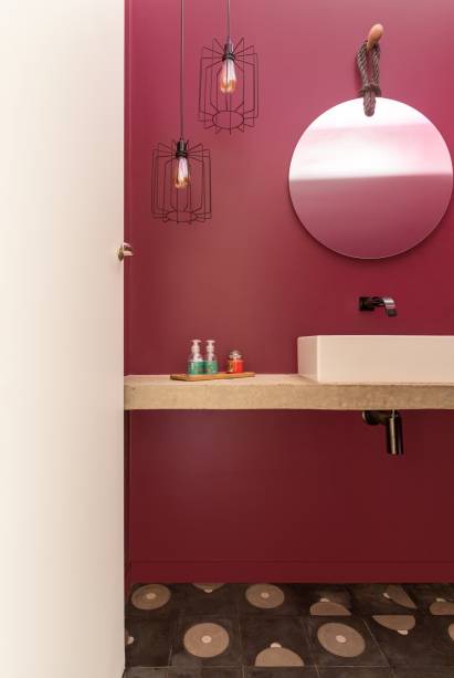 Em termos de estrutura, as arquitetas desenharam bancadas de concreto aparente, que foram executadas durante a obra, na sala e no lavabo. Esses elementos foram pintados na cor açaí para se contrapor com os tons neutros do piso. Já a laje existente foi mantida e recebeu acabamento de concreto para se integrar ao projeto. As paredes ganharam texturas brancas, que variam entre textura de chapisco, tijolinhos e pintura. No piso, o taco original do apartamento foi restaurado e brilha na decoração.
